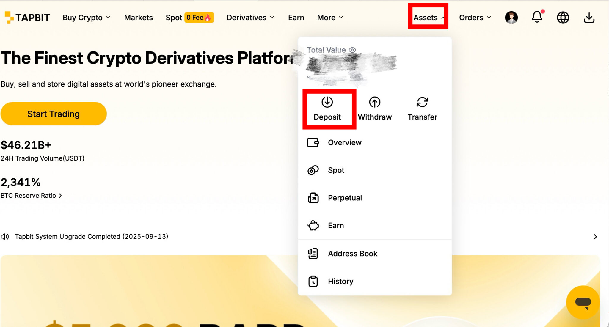 Log in to your Tapbit account on your desktop or mobile app. In the top right corner of the main dashboard, hover over the [Assets] tab, and select [Deposit] from the dropdown menu.