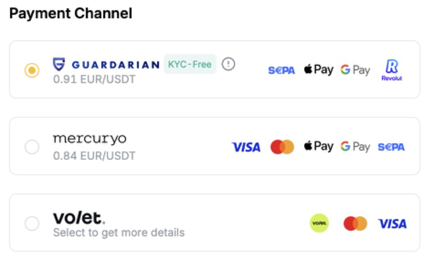 Tapbit aggregates several trusted, regulated fiat-to-crypto providers, including Guardarian, Mercuryo, Volet, and standard Mastercard/Visa processors.