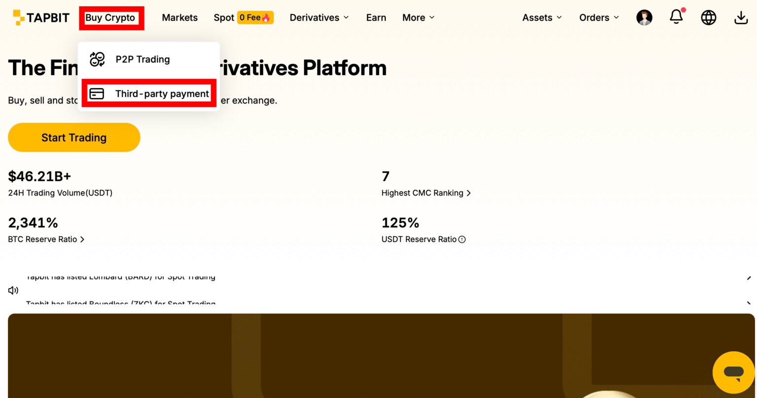 On the Tapbit homepage navigation bar, click on [Buy Crypto] and select [Third-Party Payment].
