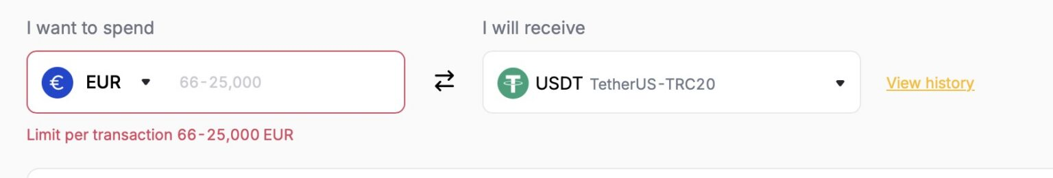 In the order widget, enter the amount of fiat currency you want to spend and select the cryptocurrency you wish to receive. The system will automatically display the minimum and maximum purchase limits for your selected currency directly within the input box.