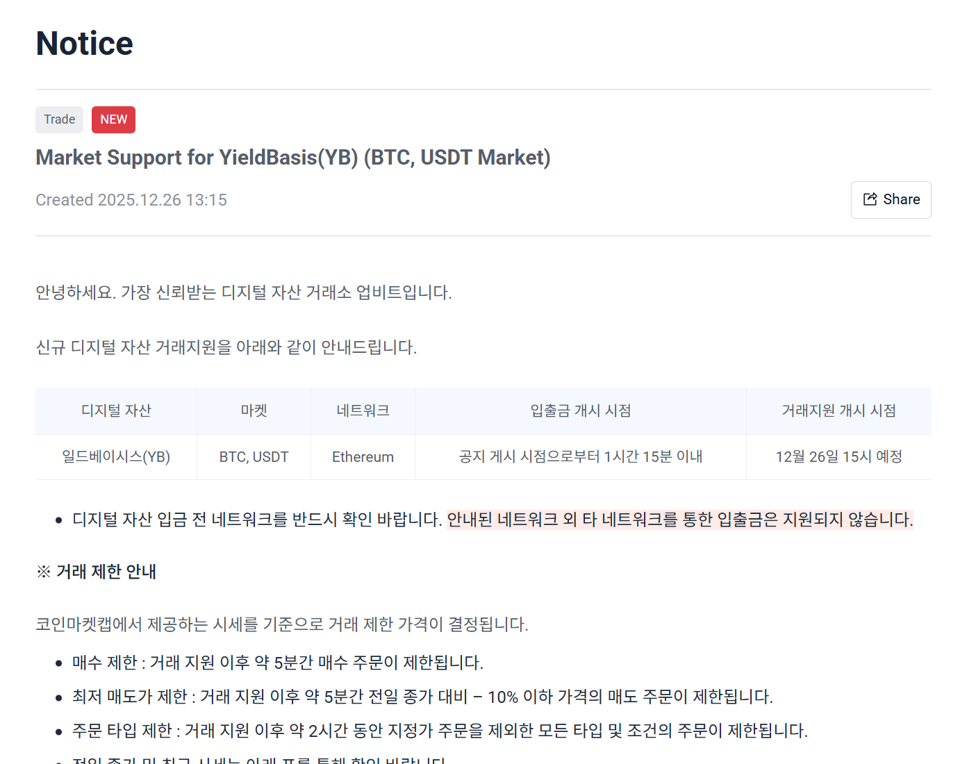 Upbit startet YB-BTC- und YB-USDT-Handelspaare 2025-12-282025-12-26 by admin BTC-0.33% Deep Tide TechFlow News, am 26. Dezember: Laut einer offiziellen Ankündigung wird Upbit YB-Handelspaare mit BTC und USDT listen.