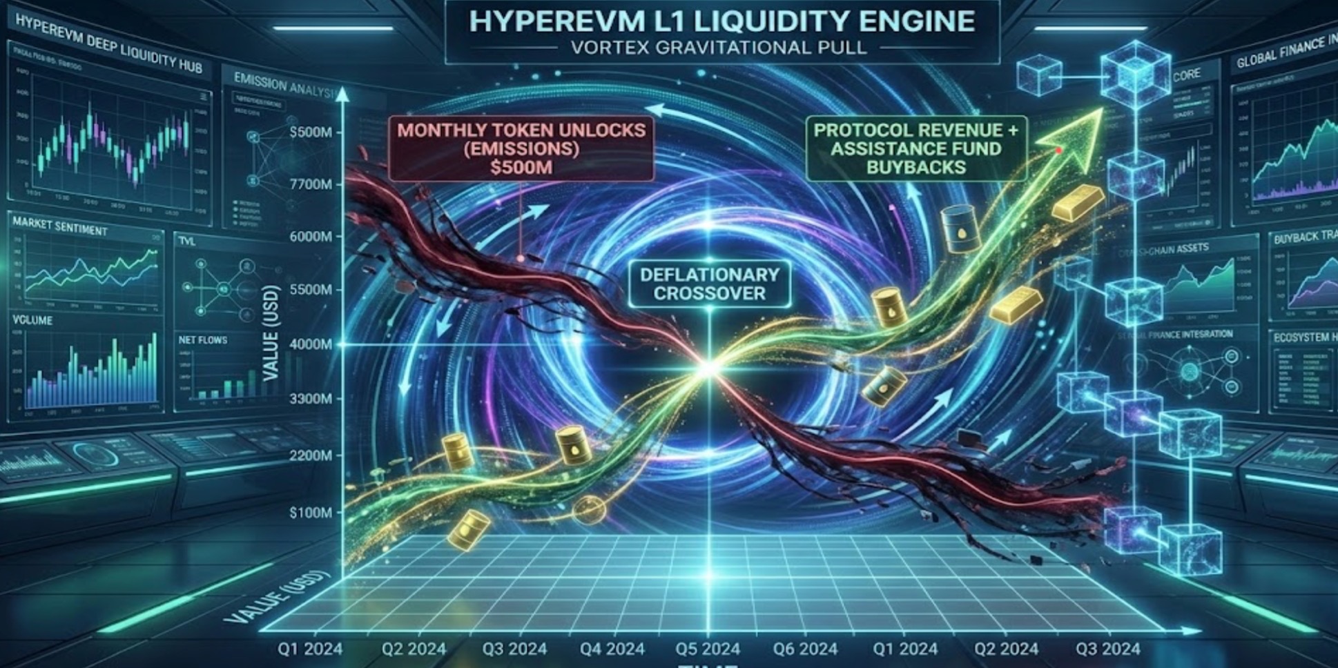 • The Revenue vs. Emission Deficit: Hyperliquid is an absolute cash cow. The protocol has facilitated over $1.5 trillion in cumulative volume and generated over $300 million in lifetime revenue. However, even with peak monthly revenues of $50M+, the incoming supply emission ($500M) mathematically dwarfs the protocol's organic fee generation.