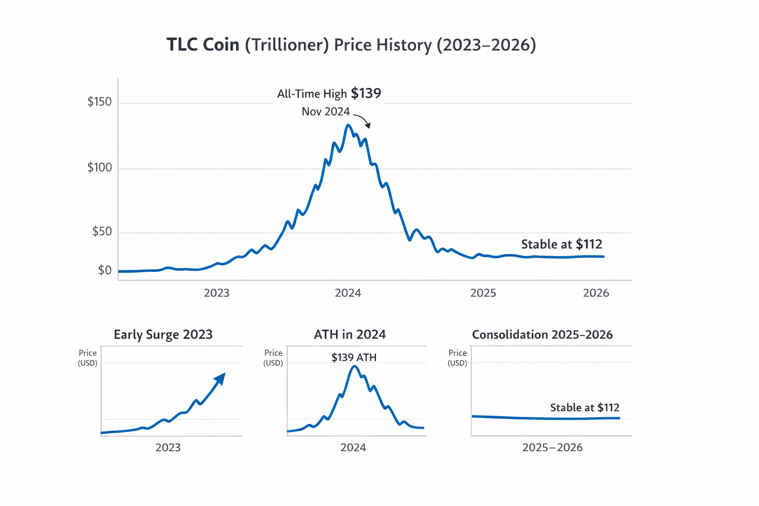 Ecosystem dependency. TLC 2.0's value is directly tied to Trillioner's platform activity. If the metaverse banking features, DeSci integrations, or the VISA card program fail to reach meaningful adoption, the organic demand case weakens — and without that, price support depends entirely on speculative positioning.