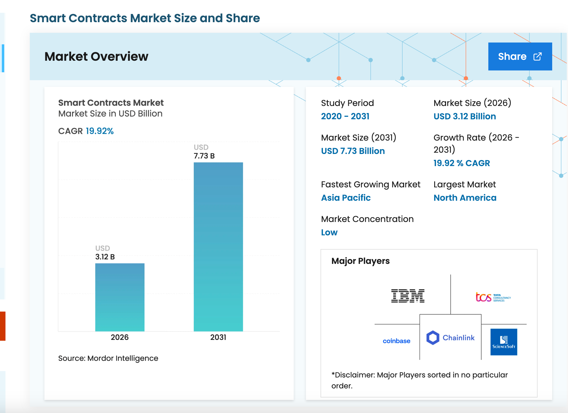 According to market research firm SkyQuest, the global smart contract market reached approximately $2.72 billion in 2024 and is projected to grow to $18.18 billion by 2033, at a compound annual growth rate (CAGR) of roughly 23.5%.