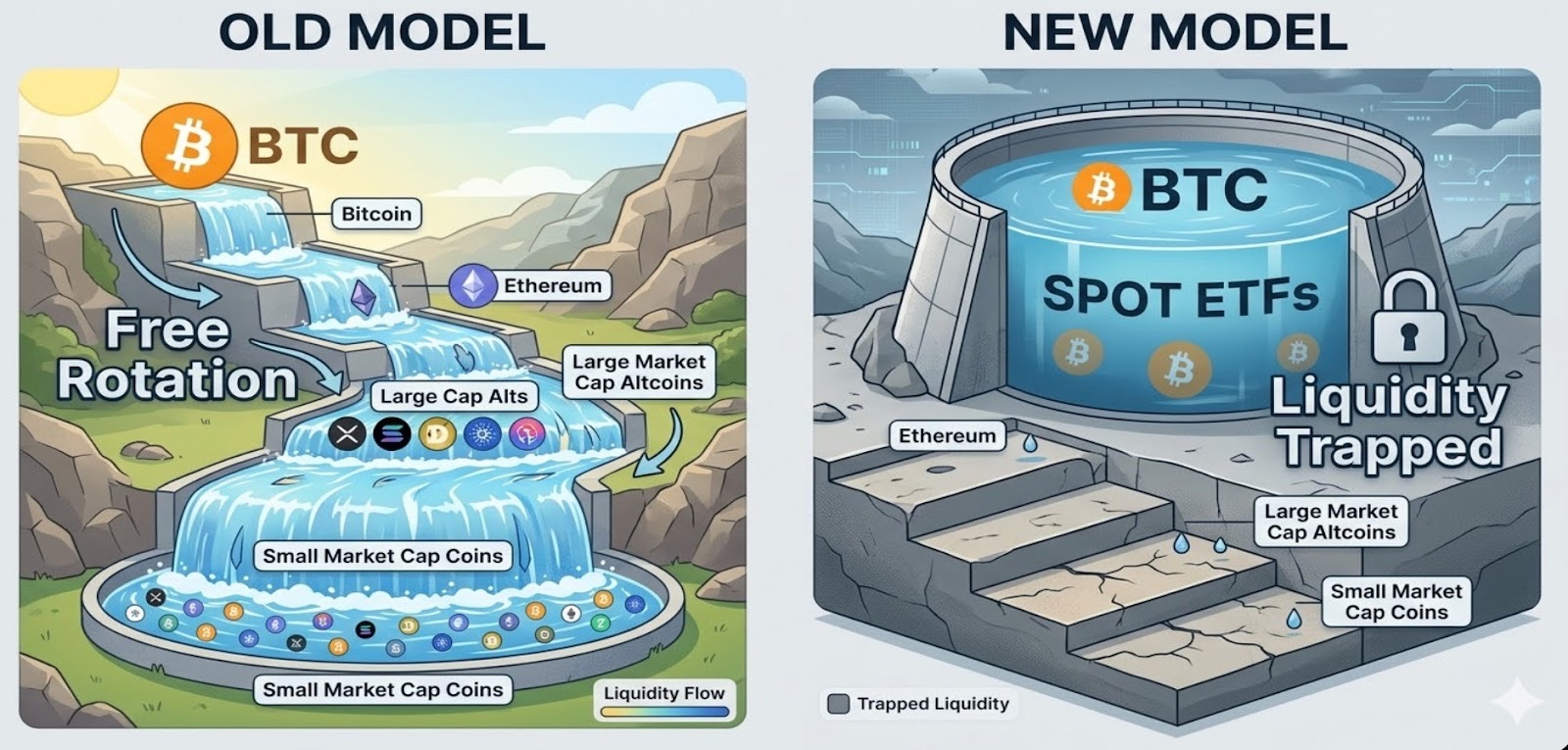Many retail investors are left wondering: Why is Bitcoin near its highs, but my altcoin portfolio is bleeding? The answer lies in a massive structural shift in how capital enters the market today. As detailed in recent institutional analyses by Bitwise and 21Shares, Wall Street's spot ETFs have successfully institutionalized crypto, but in doing so, they created "Walled Gardens" that permanently altered the crypto capital rotation cycle.