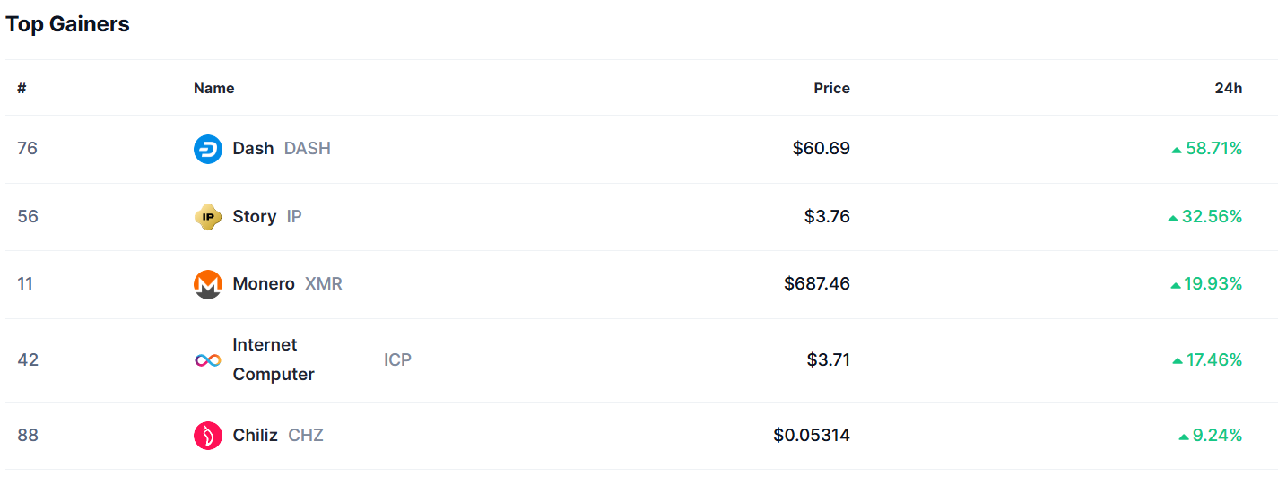 Dash(DASH)涨 58.71%,现价 60.69 美元;