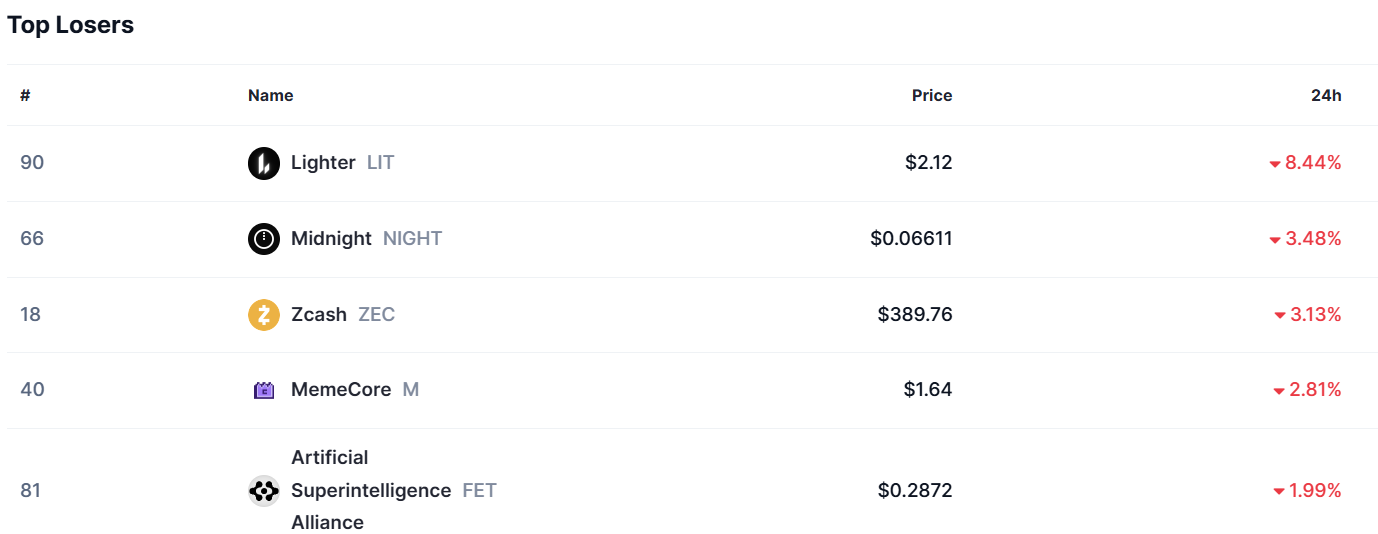 Lighter(LIT)跌 8.44%,现价 2.12 美元;