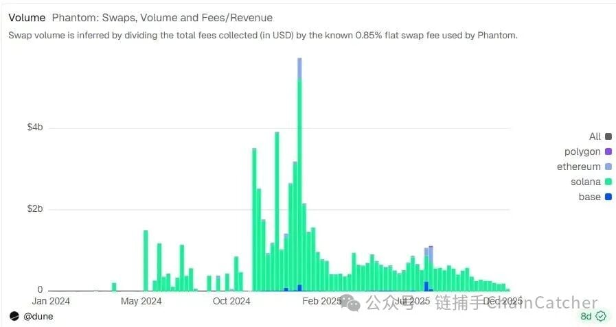 2025 will be a year of extremes for Phantom: on one hand, it will see rapid breakthroughs in user base and product development, and on the other hand, its trading volume share will be significantly eroded by exchange-affiliated wallets.