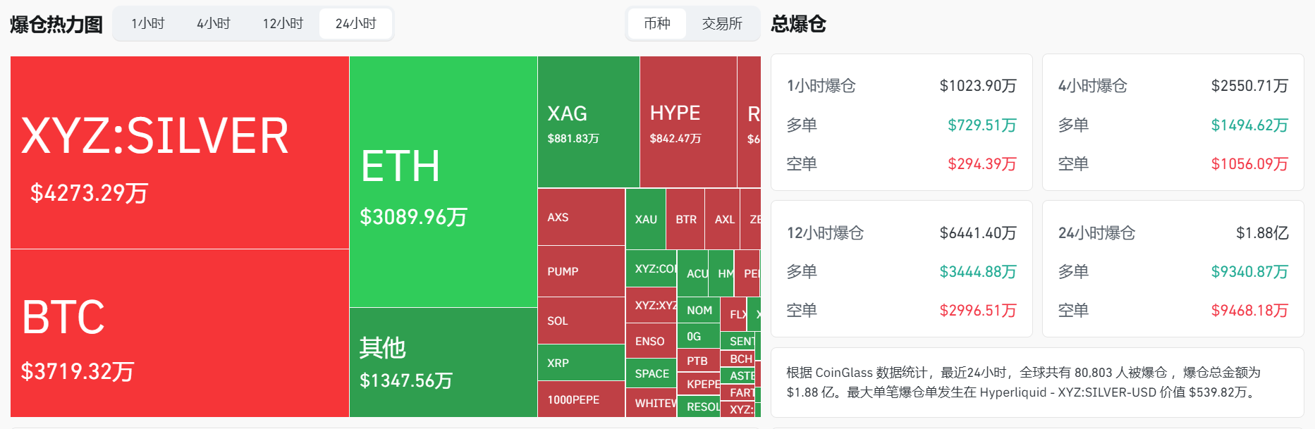 XYZ:SILVER saw liquidations of $42.7329 million, BTC had liquidations of $37.1932 million, and ETH experienced liquidations of $30.8996 million. A total of 80,803 traders were liquidated in the past 24 hours, with the largest single liquidation occurring on the XYZ:SILVER-USD trading pair on Hyperliquid, valued at $5.3982 million.
