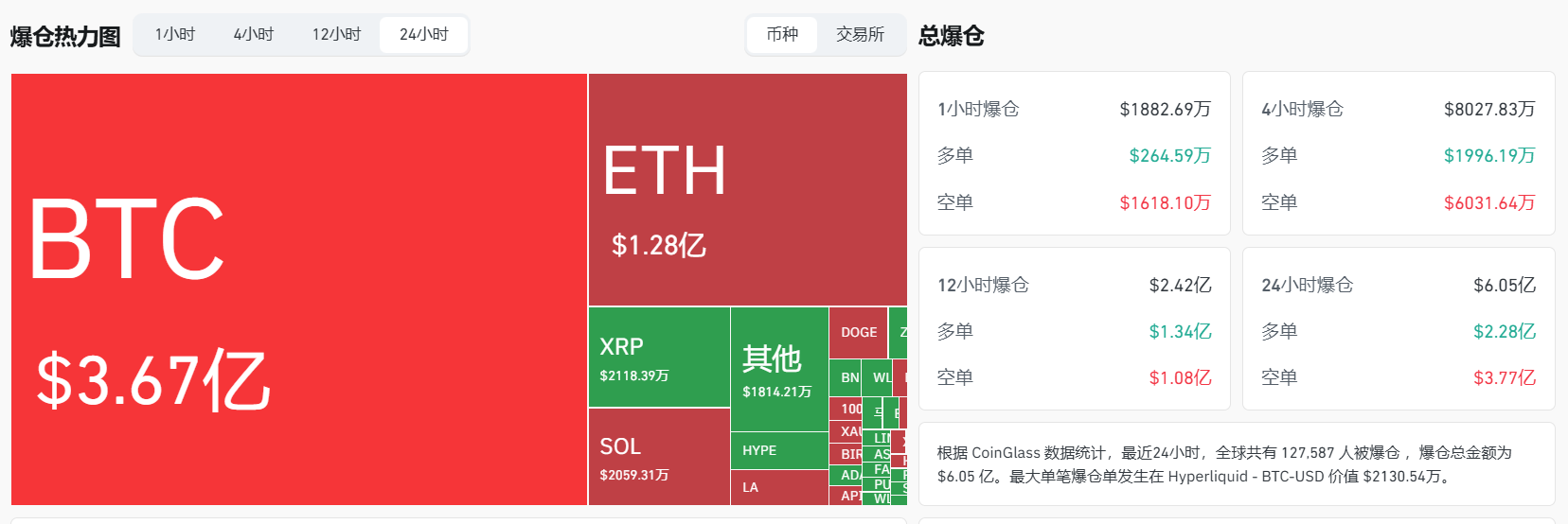 BTC liquidation amount reached $367 million, and ETH liquidation was $128 million. Over the past 24 hours, a total of 127,587 people were liquidated, with the largest single liquidation occurring on the BTC-USD trading pair on Hyperliquid, valued at $21.3054 million.