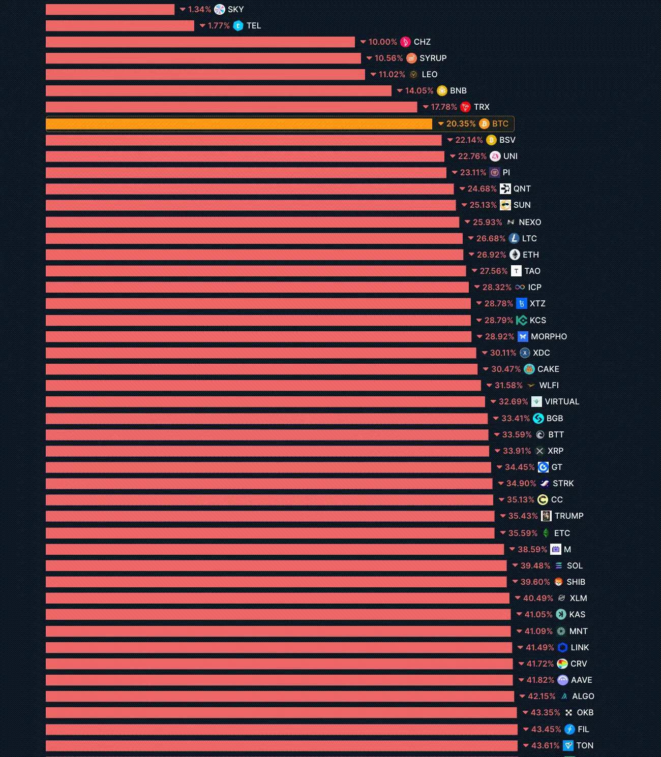 The chart indicates declines ranging from -1.34% for SKY to -43.61% for TON, reflecting a structural adjustment across the overall market, and investors need to more carefully select projects with long-term value.