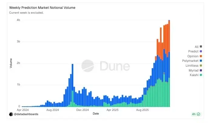 As shown in the chart, weekly trading volume in prediction markets recently saw an unprecedented exponential explosion, with peaks exceeding $4 billion.