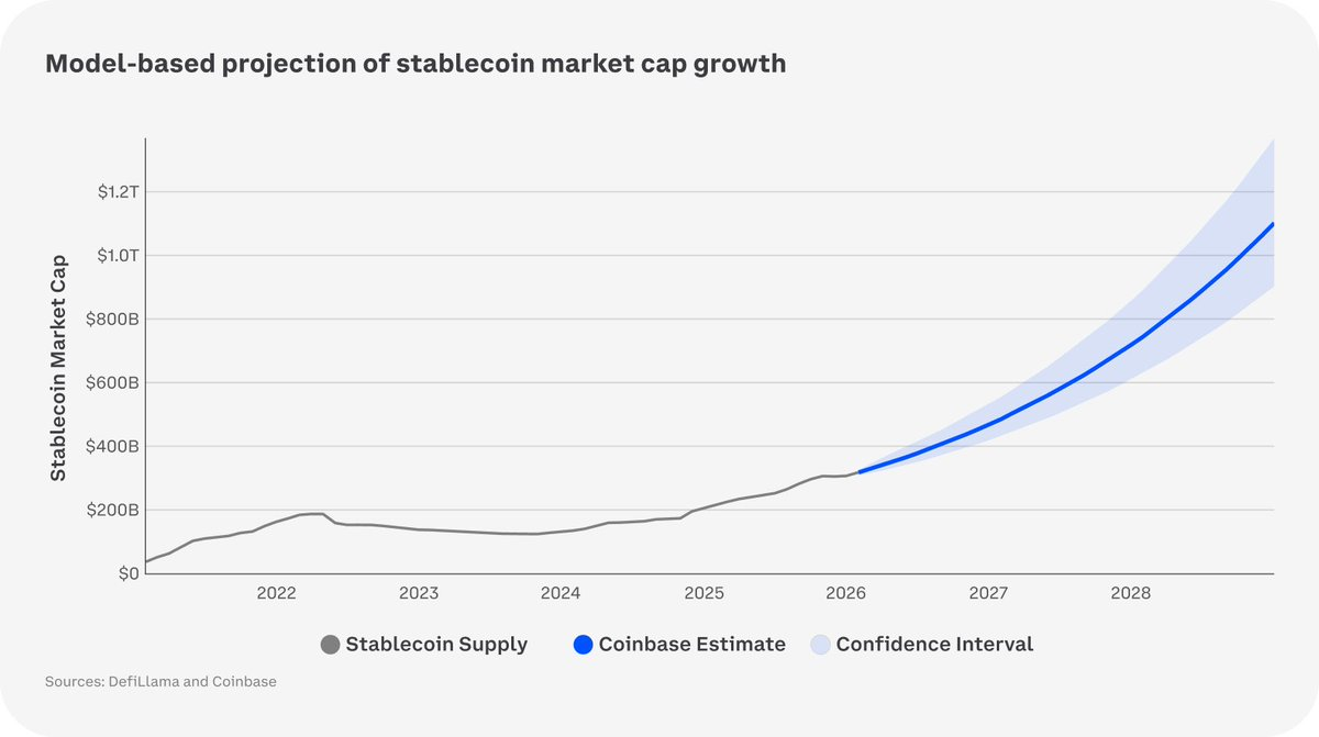 - Stablecoins y pagos: Nuestro modelo estocástico predice que la capitalización de mercado total de las stablecoins podría alcanzar un rango objetivo de 1,2 billones de USD para finales de 2028. Se espera que la adopción de stablecoins crezca aún más en casos de uso emergentes como la liquidación de transacciones transfronterizas, las remesas y las plataformas de pago de nóminas.