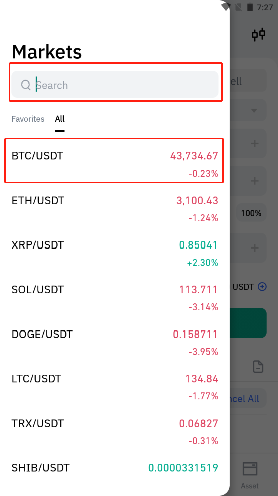 Par exemple, si vous souhaitez échanger du BTC, il vous suffit d’entrer BTC dans la boîte de recherche, puis de cliquer sur la paire de transaction que vous souhaitez échanger.