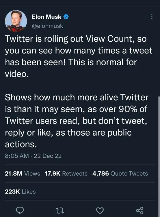 其实,所有人都能查看某条推文的浏览量,是马斯克收购推特之后带来的更新。此前,只有发帖者本人能够查看推文的浏览量。而马斯克本人亲自发推说明过如此进行更新的原因: