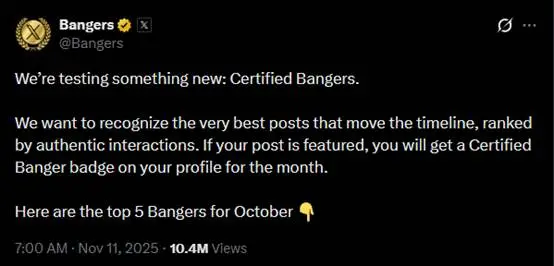 今年 11 月,推特又推出了一个名为「Bangers」的新功能,依据推文的真实互动量,不定期由官方评选出一些优质推文,并授予创作者账号「Bangers」附属勋章。这种「推文名人堂」一样的功能,为我们在「浮夸」中寻找「真实」提供了又一个依据。