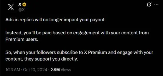 在去年 10 月时,推特官方宣布,创作者收入分成的来源不再基于出现在评论区中的广告收入,而是基于推特 Premium 会员的订阅收入。此举意在鼓励更多的优质创作者出现——一起把蛋糕做大吧,越多人给推特付钱,我们就给创作者们付更多钱。