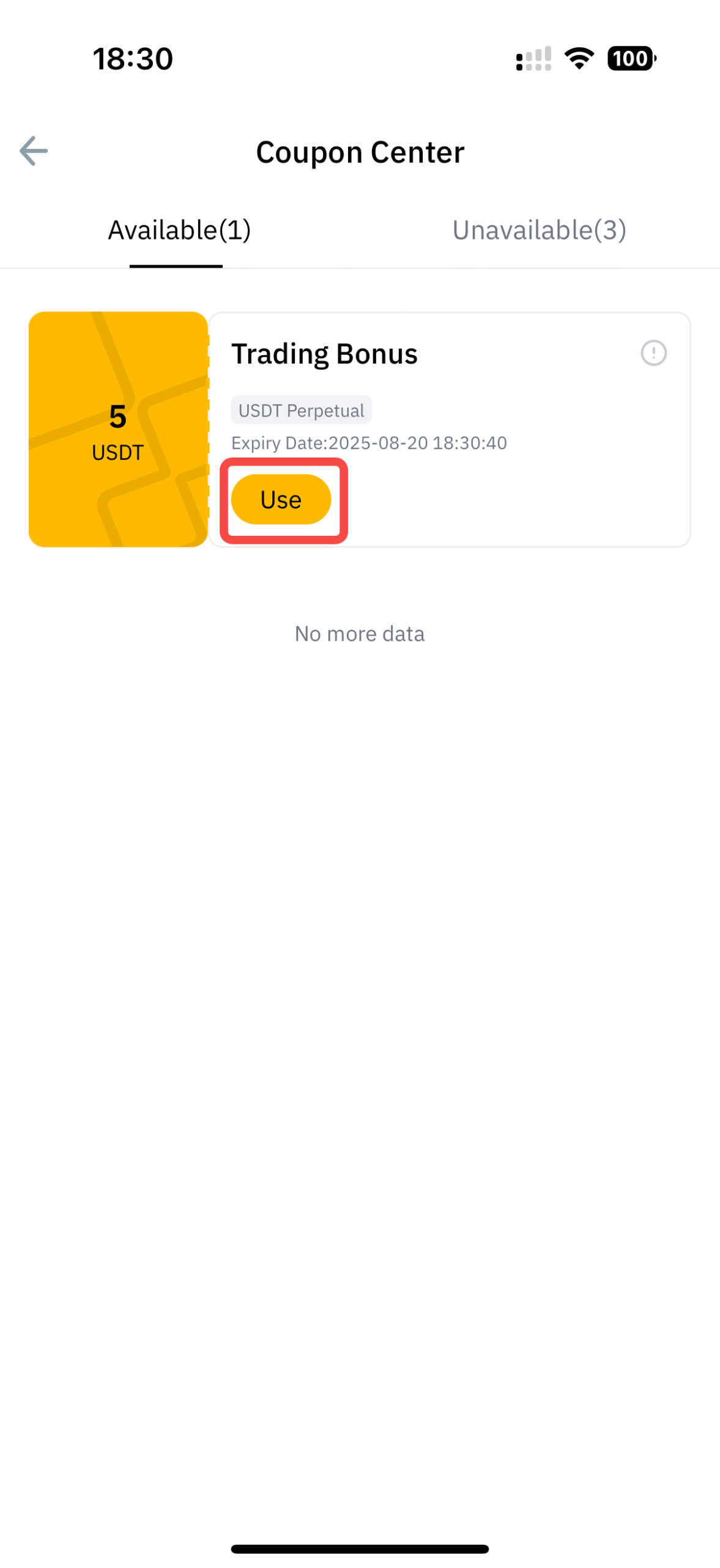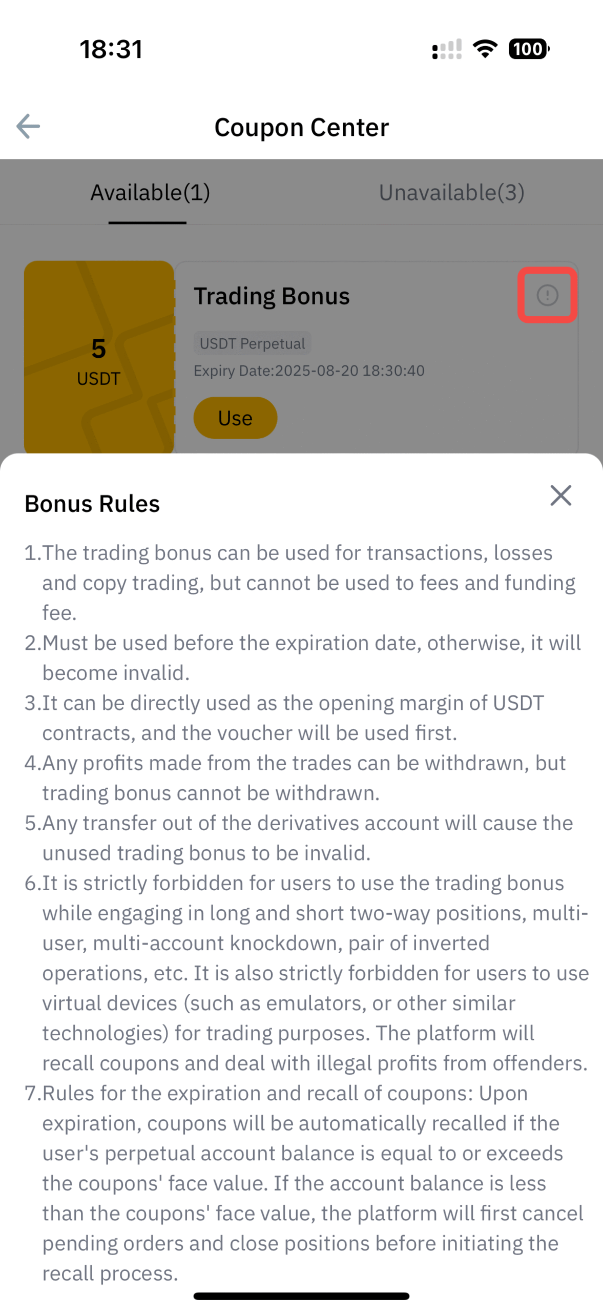 2. After entering the Coupon Center and clicking the [use] bottom, the voucher with specific value will be directly allocated to your Derivatives account.