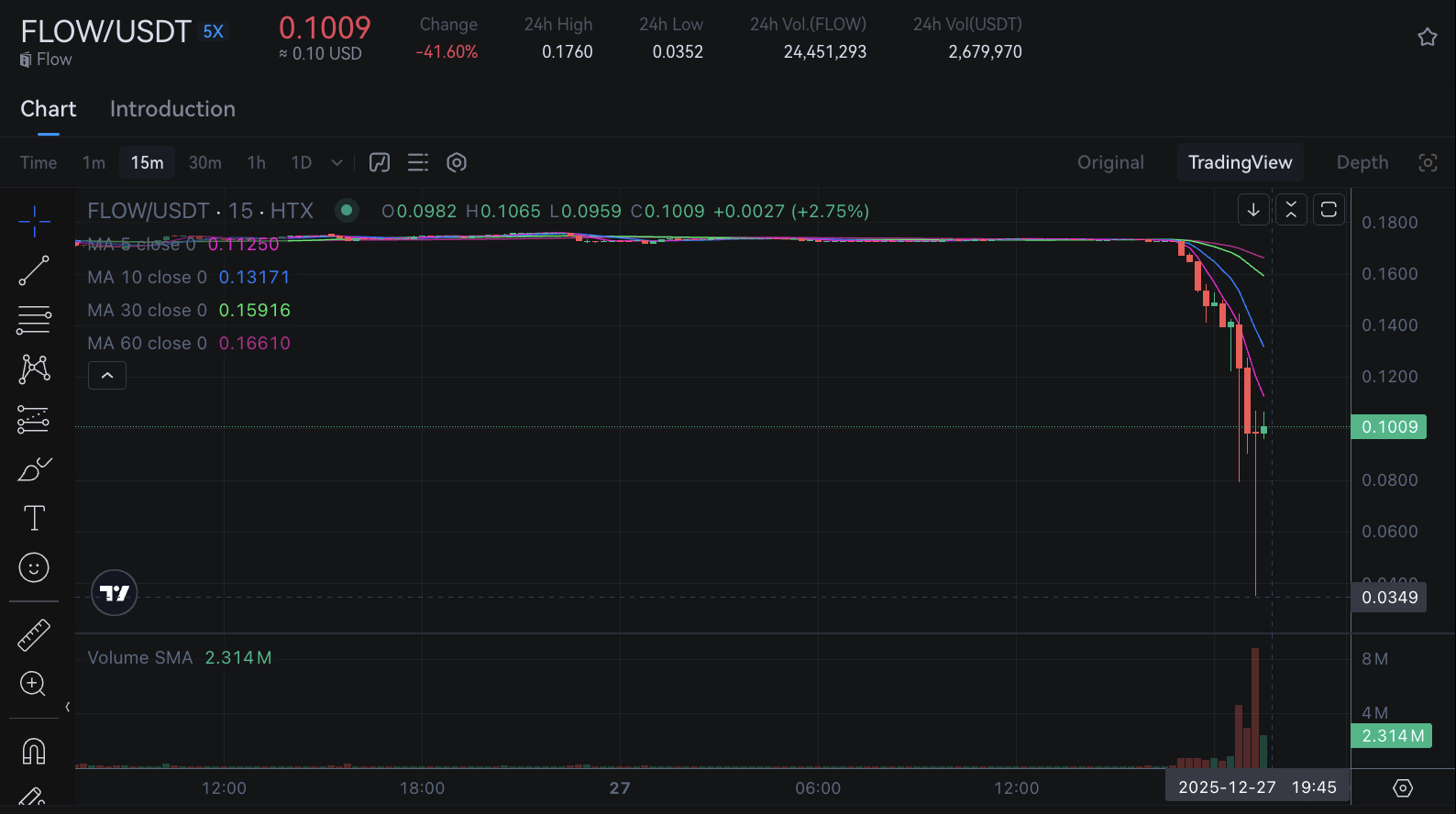 Deep Tide TechFlow Haberleri, 27 Aralık, HTX piyasa verilerine göre, FLOW bugün kısa süreliğine 0,0352 dolara düştü ve şu anda 0,1009 dolara yükselerek geri döndü, 24 saatlik düşüş %41,6 ve piyasa değeri 165 milyon dolara geriledi.